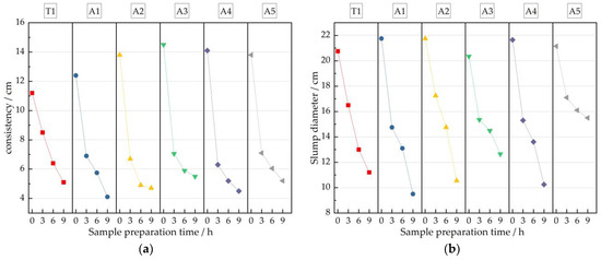 In the experiment, after the substitution of fly ash with tunneling mud in synchronous grouting, the slurry consistency was as shown in Figure 6a. From A1 to A5, as the content of shield mud replacing fly ash increased, the initial slurry consistency showed a trend of first increasing and then decreasing. At A3, the initial consistency reached a peak of 14.5 cm, which was 29.5% higher than T1. At the same time, the initial consistency value of the slurry gradually decreased at A3–A5. This was consistent with the results of Xu et al. [19] for the slurry flow properties after replacement. The main reason for this is that the particle size of fly ash is generally between 0.5 and 300 μm, which is much smaller than that of shield mud. Under equal mass conditions, the specific surface area of fly ash is larger than that of shield mud, so fly ash consumes more water than shield mud.