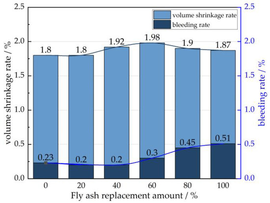 The A1~A5 data after the replacement of shield mud can be seen in Figure 7. As the content of fly ash in the replacement of shield mud gradually increased, the bleeding rate increased, but the increase was small. The volume shrinkage rate increased first and then decreased with the increase in the shield mud content. It reached a peak of 1.98% at A3, which was not much higher than that of T1, and decreased slightly at A3~A5. This was mainly because the bentonite cementitious materials used in simultaneous grouting have strong water absorption, water retention, and stability, so the replacement of fly ash with shield tunneling mud did not significantly affect the stability of the mortar.