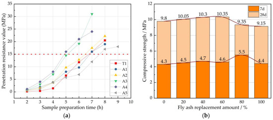 According to specifications, the time corresponding to a penetration resistance of 15N represents the setting time of the synchronous grouting slurry. As shown in Figure 8a, after the replacement of shield tunneling mud, the setting time of the mortar gradually decreased with increasing mud replacement from A1 to A4. The shortest setting time occurred at A4, reaching 4.8 h, which was 41.6% lower than that of T1. However, at A5, the setting time increased significantly to 7.8 h, exceeding the required 4 to 6 h for on-site construction. The analysis indicates that this phenomenon was mainly due to the slower hydration reaction of fly ash compared to cement during the early hydration process of cement mortar. As a result, the early strength of cement mortar was not adequately compensated. Therefore, when shield tunneling mud was used to replace fly ash, the mortar exhibited better stability and higher strength in the early stages of setting, leading to a faster setting rate. The delayed setting observed at A5 was attributed to the increased presence of coarse particles from the shield tunneling mud in the slurry, which reduced the contact area for cement hydration reactions, ultimately resulting in a significant increase in setting time.