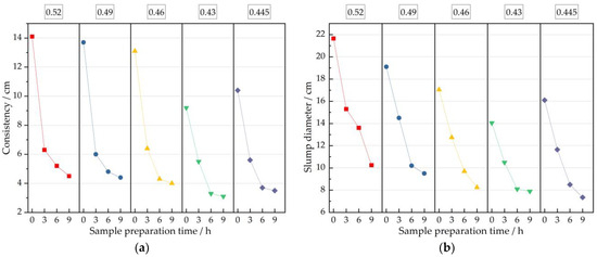 The influence of water–binder ratio adjustment on slurry fluidity: (a) experimental trends in slurry consistency; (b) experimental trends in slurry slump diameter.