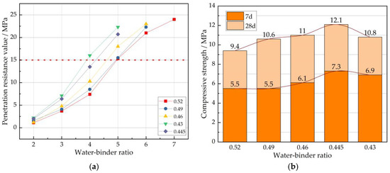The influence of water–binder ratio adjustment on slurry strength: (a) experimental trends in the setting time of slurries; (b) experimental trends in slurry compressive strength.