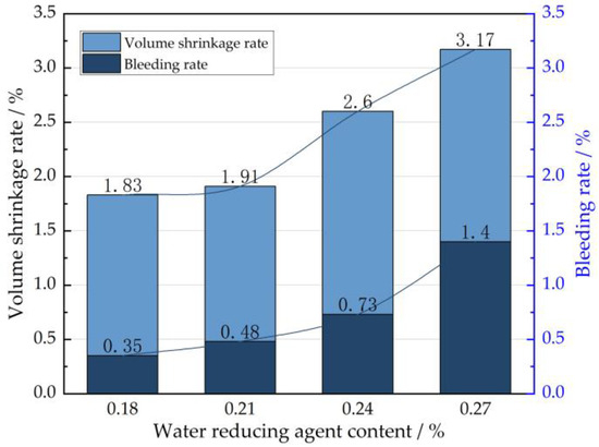 In Figure 12, it can be observed that the bleeding and volume shrinkage of the slurry synchronous grouting solution with added polycarboxylate-based water reducer increased with the dosage of the reducer, reaching a peak at a dosage of 0.27%. Both values remained below 3.5%, indicating a stable performance. The polycarboxylate superplasticizer exhibited good plasticity, bleeding resistance, and segregation during the experimental process.