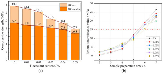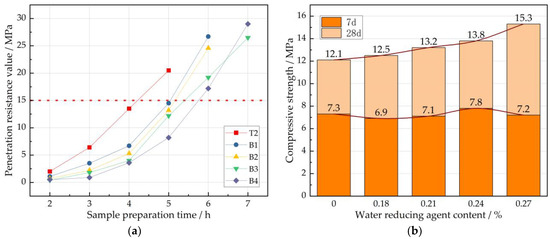 I The influence of different dosages of water-reducing agent on the strength of slurry: (a) experimental trends in the setting time of slurries; (b) experimental trends in slurry compressive strength.