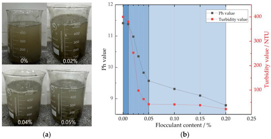 From the experimental photos in Figure 14a, it can be observed that, with increasing HEMC content, the upper-layer liquid became clearer. The data comparison in Figure 14b shows that, with the gradual increase in HEMC content, both pH and turbidity exhibited an overall decreasing trend. The change in these parameters can be divided into three segments: at 0~0.01%, the decrease in pH and turbidity was slow; at 0.01%~0.05%, there was a significant sudden change in both pH and turbidity; then, from 0.05% to 0.2%, they gradually stabilized. The above pH and turbidity test results are consistent with the findings of Ruan et al. [24].
