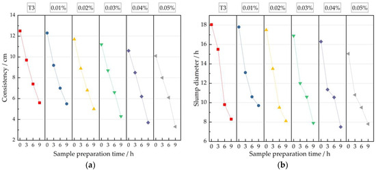 The influence of different dosages of water-reducing agent on the fluidity of slurry: (a) experimental trends in slurry consistency; (b) experimental trends in slurry slump diameter.