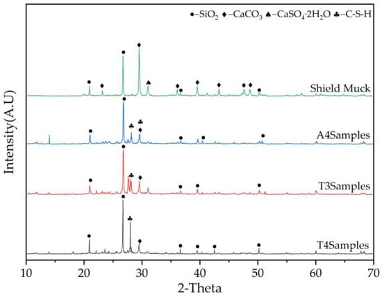 From the XRD spectrum in Figure 17, it can be seen that the shield mud was mainly composed of SiO2 (quartz), CaCO3 (limestone), CaSO4-2H2O (gypsum dihydrate), and other chemicals. It was relatively more similar to a silica–aluminum type of fly ash in terms of chemical composition, and it was found that, when the shield mud was replaced by the fly ash in the synchronous grouting, the diffraction peaks of CaCO3 contained in shield mud in A4 disappeared, and the hydration products C-S-H in the synchronous grouting solution increased, which was mainly due to the hydrolysis reaction CaSiO3 + 2H2O → C-S-H of the hydrolysis product CaSiO3 after contact with water. The main reason for this is that CaCO3 underwent a hydrolysis reaction of CaSiO3 + 2H2O → CA(OH)2 + H2 + SiO2 after contact with water, and the generated Ca(OH)2 and SiO2 participated in the reaction to produce C-S-H gel, which is the most important factor for the strength formation of the grouting solution. From the above chemical reaction, it can be seen that the shield mud can be used to replace fly ash in the microscopic aspect, and at the same time give good strength performance to the slurry.
