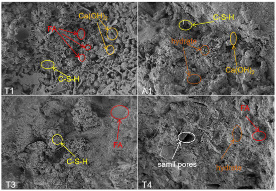 After curing for 28 days, SEM testing was performed on T1, A4, T3, and T4. In Figure 18, at a scale of 10 μm, it can be observed that, after replacing 80% of fly ash, the smooth spherical particles representing fly ash in A4, T3, and T4 significantly decreased. Partially overlapping hydration products are also visible. Additionally, in T4, partial pores can be observed, attributed to the “air entrainment” effect of HEMC. The addition of HEMC to the slurry led to the presence of numerous pores in the cementitious matrix, causing internal structural looseness and ultimately reducing the compressive strength of T4.