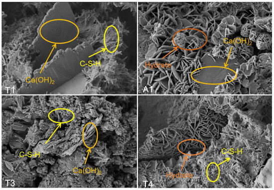 At the 1 μm scale in Figure 19, abundant C-S-H cementitious products and hydrated products such as Ca(OH)2 can be observed in T1. After substitution, A4, T3, and T4 all exhibited a cross-overlapping lamellar hydration product, characterized by a unique spatial arrangement, providing robust strength support to synchronous grout slurry in the later stage of strength formation. Furthermore, the surfaces of lamellar Ca(OH)2 hydrates in A1 were relatively smooth. However, on the surface of T3 treated with polycarboxylate superplasticizer, a significant amount of C-S-H binding material adhered, indicating that the addition of polycarboxylate superplasticizer delayed hydration time, thereby enhancing hydration more thoroughly. At the 1 μm scale of T4, a significant amount of C-S-H gel was also found, indicating that hydroxyethyl methyl cellulose had little influence on the hydration reaction.