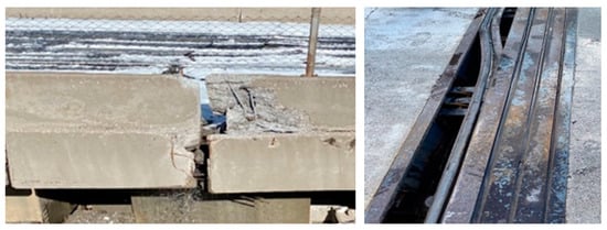 The Deve Geçidi Viaduct, located on the Diyarbakır-Ergani State Road, has a length of 572 m and features 14 spans. It is a prestressed reinforced concrete simple beam bridge, which was constructed in 2019. In Diyarbakır province, at the TK2101 station, during the M7.7 earthquake, the recorded PGAH values in the E-W and N-S directions are 71.42 cm/s2 and 77.08 cm/s2, respectively. The PGAV value in the vertical direction is 33.53 cm/s2. The shear wave velocity of the foundation soil at the TK2101 station is 519 m/s []. The epicenter-to-station distance for the M7.7 earthquake is 287.35 km and the station-to-viaduct distance is 18.16 km. The only observed damage resulting from the longitudinal effect of the M7.7 earthquake was the expansion joint opening damage, as indicated in Figure 12.