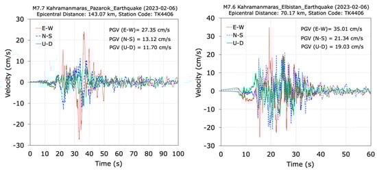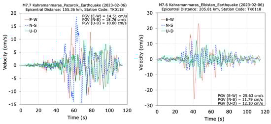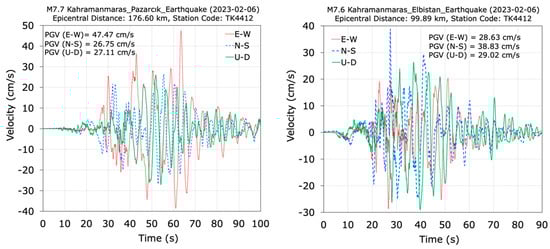 Velocity–time histories recorded at the TK0118 station during the M7.7 and M7.6 Kahramanmaraş earthquakes.