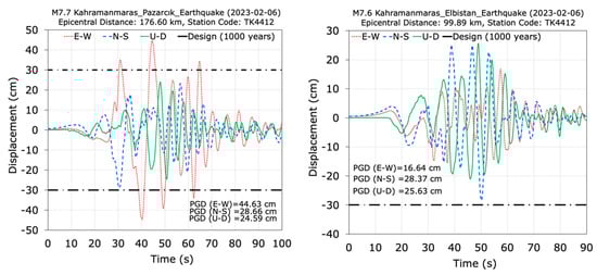 Acceleration spectra graphs with 5% damping for the M7.7 and M7.6 earthquakes at the TK4412 station are presented in Figure 21b for the two horizontal directions (E-W and N-S) and the vertical (U-D) direction, along with the bridge design curve for a 1000-year return period. As can be seen from Figure 21b, the spectral accelerations recorded in the E-W, N-S, and U-D directions at the TK4406 station for the M7.7 earthquake are significantly lower than the design spectral accelerations. They are below the design spectral values along the period range. However, the spectral accelerations recorded at the TK4412 station have effective values in the range of 0.2 s to 2 s. Considering that the bridge’s periods fall within this range, it can be stated that the M7.7 and M7.6 earthquakes caused significant demands on the bridge.