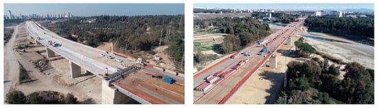 The Tohma Bridge was constructed in 2021 and situated on the Tohma Stream within the boundaries of Malatya province, precisely at coordinates 38.23858° E and 38.50476° N. The superstructure of the bridge was designed as a steel composite continuous beam with reinforced columns. The total length of the bridge with nine spans is 517.50 m. The bridge consists of two edge piers (A1 and A2) and eight central piers (P1–P8). The span lengths are 34.5 m between A1 and P1, 69 m between P2 and P6 (six spans), and 34.5 m between P7–P8 and P8–A2 (two spans). Some views from the bridge are shown in Figure 14.