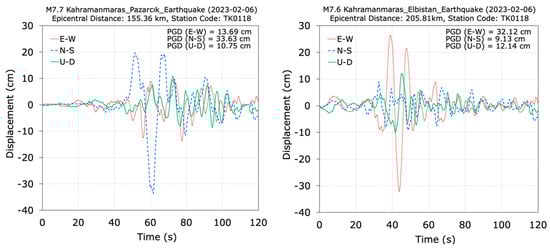 Displacement time histories recorded at the TK0118 station during the M7.7 and M7.6 Kahramanmaraş earthquakes.