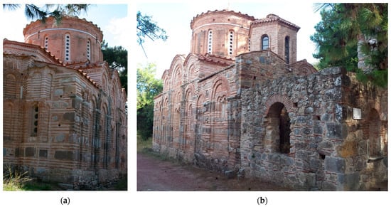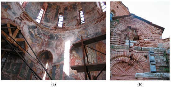 Figure 8a,c present the NE and the central part of the N façade of the main church, before the restoration intervention; damaged and decayed mortars and bricks can be seen, while some of the recessed bricks under the deteriorated surface mortars are also apparent.