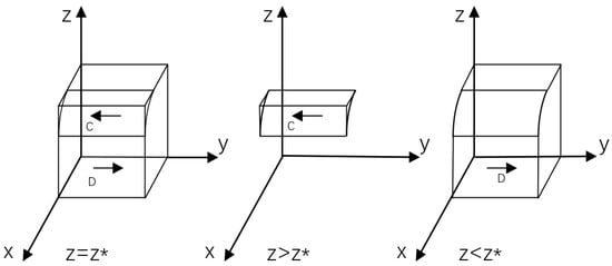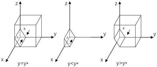 From F(x) = F(y) = F(z) = 0, the following nine local equilibrium points of this game model can be obtained, which are (0, 0, 0), (0, 1, 0), (0, 0, 1), (0, 1, 1), (1, 0, 1), (1, 1, 0), (1, 0, 0), (1, 1, 1), (x^, y^, z^). (x^, y^, z^) is the mixed strategy of evolutionary games, whereas in multi-party evolutionary game systems, stable strategies only appear in pure strategies, hence the subsequent game analysis does not discuss mixed strategies. The Jacobian matrix of the three-party evolutionary game system is as follows: