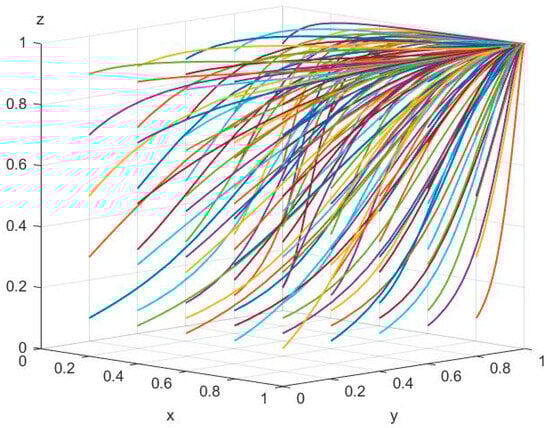Based on the results of the evolutionary game above, to verify the effectiveness of the evolutionary stability analysis, we used MATLAB R2022b to simulate the dynamic evolution of the strategies of SMBMEs, banks, and third-party intermediary platforms under different parameter levels. This further proves the effectiveness of the evolutionary game model and shows that all different initial points will evolve towards the equilibrium point (1, 1, 1). Chen et al. (2022), Huang et al. (2018), and Xu et al. (2019) have summarized the parameter value range for the evolutionary game model simulation parameters [