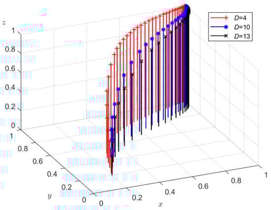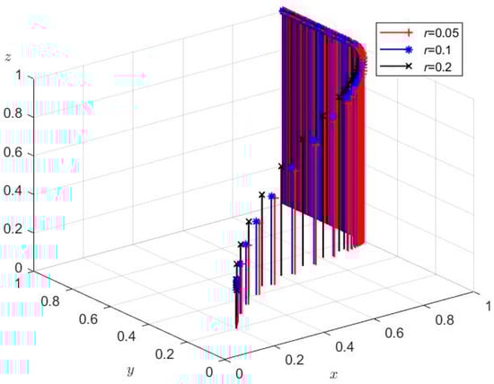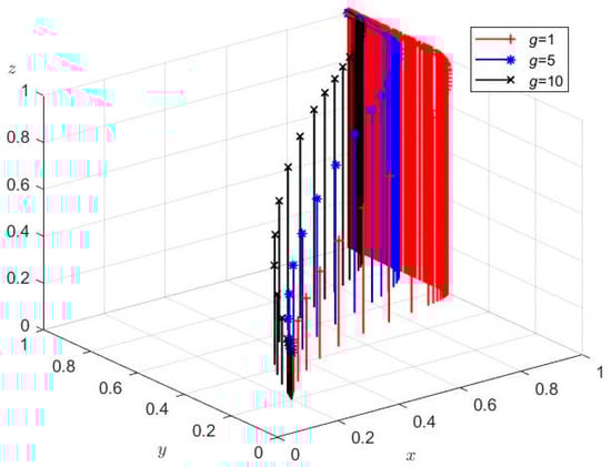Figure 5 shows that there exists an evolutionary stable point (1, 1, 1), that is, the strategy combination of SMBMEs, banks, and third-party intermediary platforms of (On-time repayment, Cooperation, Cooperation) is the ESS combination. Therefore, this evolutionary result shows that under the participation of a third-party intermediary platform as a cooperative guarantee, SMBMEs repay bank loans on time, banks actively cooperate to issue loans, and the three parties jointly cooperate in the operation of the GPPFG business. It can be seen that the simulation analysis is consistent with the conclusion of the stability analysis of each party’s strategy and has effectiveness, which is of practical guiding significance for the promotion of the GPPFG business.