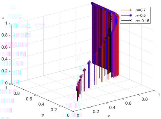 Figure 8 analyzes the impact on the three-party strategy under different levels of GP value change rates, respectively setting the change rate of the GP of SMBMEs in the trading market as n = −0.15, 0.5, 0.7.