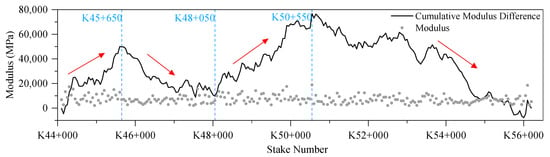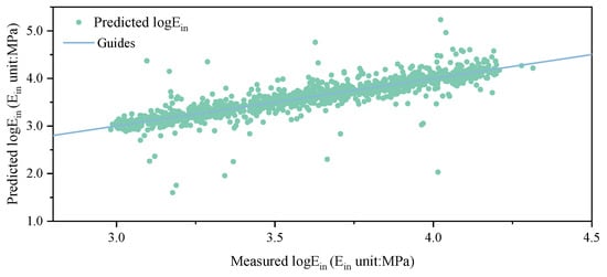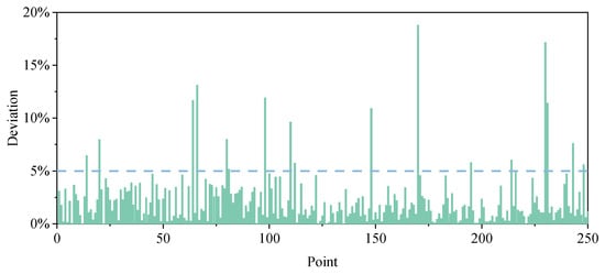 Figure 7 illustrates the deviations between the predicted and actual values of the GEP model within the validation dataset. A majority of the deviations are below 5%, with only 7.1% of the observations exhibiting a deviation exceeding 5%. The maximum deviation is 18.8% and the average deviation is 2.3%. These values suggest that the predictive model, which utilizes gene expression analysis, exhibits a high degree of accuracy. This is mainly due to the reliability of the GEP algorithm, which greatly improves the effectiveness of model construction. In addition, different from the deduction of the model itself, GEP fully utilizes the fitting data to construct the dynamic modulus prediction model, so that a better fitting effect can be obtained.