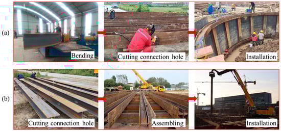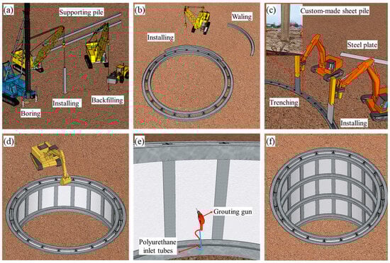 - Guan, C.; Yang, Y.; Wang, C. Rapid excavation with a newly developed retaining system: Spiral assembly steel structure. J. Cent. South Univ. 2015, 22, 2719–2729. [Google Scholar] [CrossRef]