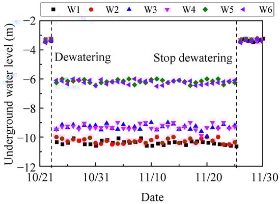 - Ni, X.; Lu, J.; Wang, Y.; Shi, J.; Chen, W.; Tang, L. Field investigation of the influence of basement excavation and dewatering on ground and structure responses. Tunn. Undergr. Space Technol. 2021, 117, 104121. [Google Scholar] [CrossRef]