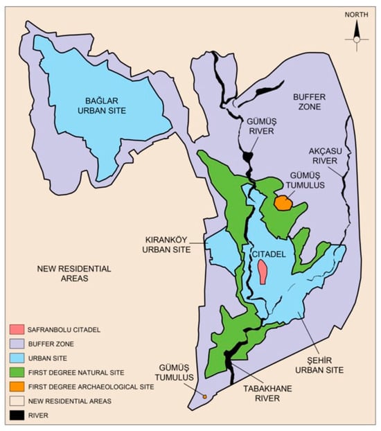 Safranbolu is located on the caravan route connecting Central Anatolia to the Western Black Sea region. With the public improvement works carried out according to these commercial routes, Safranbolu developed between the 16th and 19th centuries and gradually attained its present appearance. Today, the historical city of Safranbolu allows one to experience traditional life, and consists of three settlements: Şehir (Old Bazaar), Kıranköy, and Bağlar, which were identified as areas whose architectural character should be preserved in the 1968 Master Plan []. In the 1990 Master Plan, these areas were taken under preservation as urban sites [], and the natural beauty of Safranbolu and the tumulus on the hills were also declared as natural and archeological sites (Figure 2). With the 2010 Master Plan, a buffer zone was defined around these sites [], thus aiming to preserve the authenticity of Safranbolu.