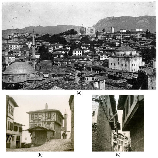 Old view of Şehir (a), a Şehir house (b), and an old view of a street in Şehir (c) [].