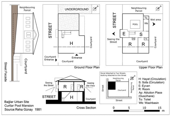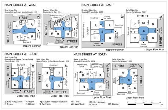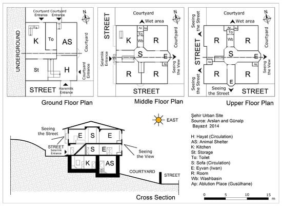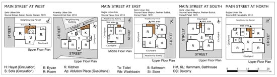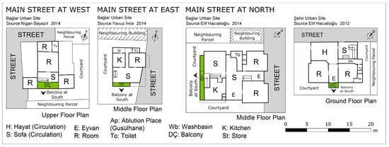 Petruccioli analyzed Mediterranean and Islamic cities at the urban and building scale. The number of spaces that make up the house and their relationship with the topography were evaluated together with plans, sections, and elevations. The housing typology in cities was analyzed with a morphological approach. In the study, it is mentioned that the Turkish house should be analyzed together with its immediate surroundings; it is not enough to evaluate only the upper floor plans to express the spatial richness and design practices of the houses [].