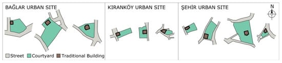 Houses in urban sites vary with the effects of topographic data as well as the differences created by social life. The land structure has affected the settlement pattern in the sites. There is a flat structure in Bağlar, both flat and sloping in Kıranköy and a highly variable sloping structure in Şehir. This has affected the parcel geometries. Another factor affecting the parcels is the streets. In the studies examining Safranbolu houses, the importance of the street can be explained from various aspects []. In the sites analyzed in this study, four types were identified according to the number of streets around the parcel, and the houses established direct relations with the street.