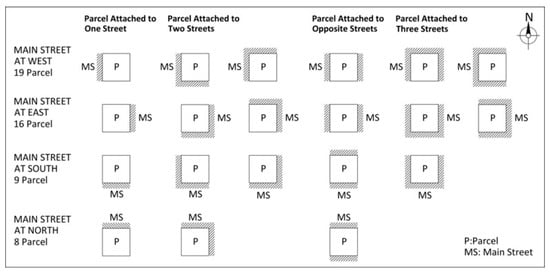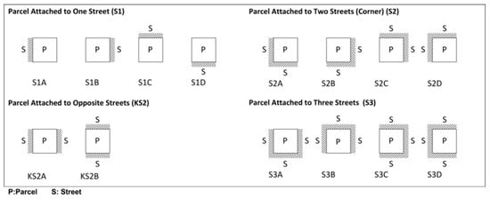 Parcel–street relationship: Depending on the number and width of the streets around the parcel, there were parcels attached to one, two, or three streets and parcels attached to opposite streets.