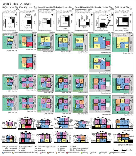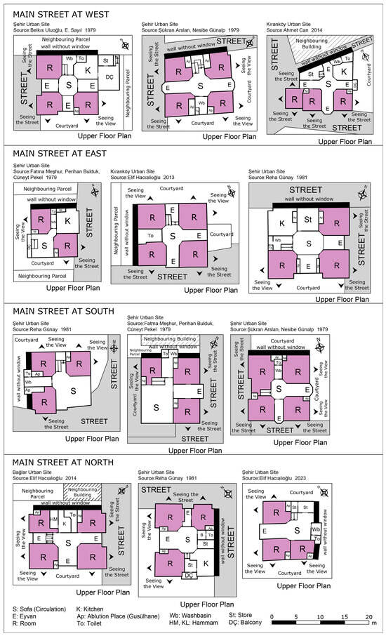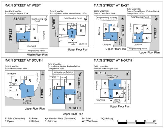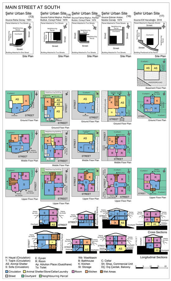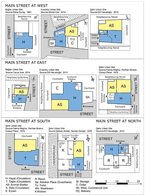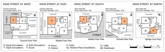 Fifty-two buildings were constructed in different urban sites, and twenty-three were compared within the scope of the study. The houses were numbered and explained to better understand the planning principles. The entrance street of twenty-three typical houses was in the west in five houses (Figure 27), in the east in seven houses (Figure 28), in the south in five houses (Figure 29), and in the north in six houses (Figure 30). Since the direction of the parcel entrance street affected the internal organization of the spaces, the houses were shown in groups.