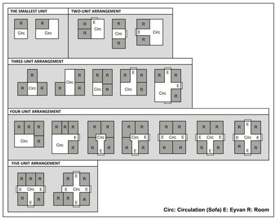 The most basic unit constituting the Turkish house is the ‘room’, which represents an independent and specialized space. The ‘hayat’ is a circulation space connecting the rooms and maintains social relations. The Turkish room is like a tent, where all needs are met under a cover with special and distinctive interior space elements []. The house form is established by arraying the tents, where family members live separately, around a common area. This diagram explains the relationship between rooms and hayats in the Turkish house []. Semi-open hayats were converted into closed spaces called ‘sofa’ in time []. In the sofas, which bring together various numbers of rooms, some areas are specialized and turned into ‘eyvan’ (iwan). The iwan placed between the rooms provides privacy. At the same time, the sofa, which is surrounded by rooms, receives daylight due to the windows in the iwans. Apart from this, spaces such as an animal shelter, kitchen, storage/cellar, shop, toilet, and hammam can be found in different parts of the house.