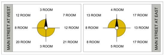 The direction of the main street associated with the parcel determined the location of the house’s entrance façade and the entrance door. Accordingly, it affected the layout of units in the interior space arrangement. The streets provided entrances from the west, east, south, and north (Table 3). Accordingly, the entrance facades of traditional Safranbolu houses were generally oriented to the west and east (Figure 11).