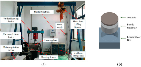 (a) Large-scale straight shear instrument. (b) The arrangement of the concrete slab in the lower shear box.