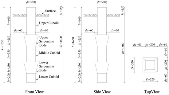 The PV (photovoltaic) bracket’s serpentine pile foundation consists of a combination of three concrete rectangular bodies and two concrete prismatic bodies, with the serpentine body representing the variable cross-section part. The three views are presented in Figure 2.