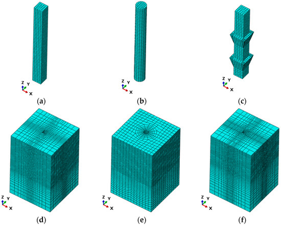 Grid division of each model. (a) Square pile. (b) Round pile. (c) Serpentine pile. (d) Soil around square pile. (e) Soil around circular pile. (f) Soil around serpentine pile.