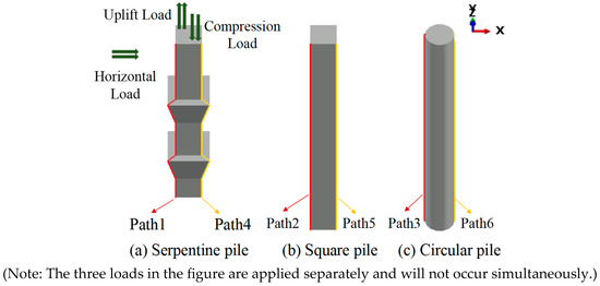 - When the pile experiences tension or compression, due to load symmetry, the stress paths exhibit similar behavior. For compression or tension analysis of the pile’s bearing characteristics, stress paths 1, 2, and 3 are extracted to characterize the stress distribution along the pile body.