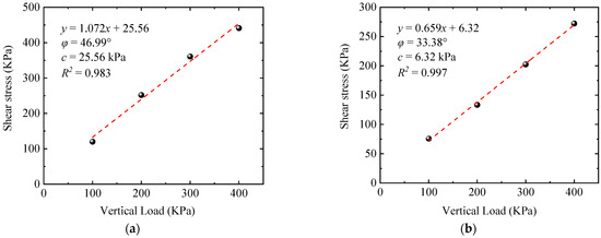 The shear strength versus positive stress curves for the sand–sand interface are depicted in Figure 5a, while those for the sand–concrete interface are presented in Figure 5b. The R2 values for each curve exceed 0.98, indicating a strong fit. The cohesion and internal friction angle values are illustrated in Figure 5.
