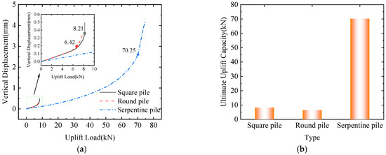 In Figure 6, the load–displacement curves and ultimate uplift bearing capacities of different pile types are compared under uplift loads. Square piles exhibit a slightly higher ultimate uplift bearing capacity than round piles, but both fall below 30 kN, failing to meet the necessary standard. Conversely, the serpentine pile showcases an ultimate uplift bearing capacity of 70.25 kN, surpassing that of the square pile by 8.56 times and the round pile by 10.94 times.