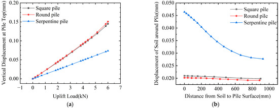 Figure 7a displays the vertical displacement changes at the pile top as the uplift load increases from 0 kN to 6 kN for the three pile types. The soil displacement around the piles at a 6 kN uplift load is also depicted. Notably, under equal uplift loads, the vertical displacements at the tops of square and round piles are comparable and exceed that of the serpentine pile. Specific values at 6 kN reveal a vertical displacement of 0.151 mm for the square pile, 0.150 mm for the round pile, and only 0.075 mm for the serpentine pile. The vertical displacements at the tops of square and round piles are roughly double that of the serpentine pile due to the anchoring effect of its corrugated body impeding upward displacement.