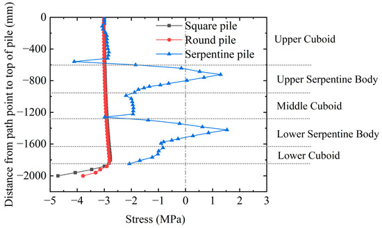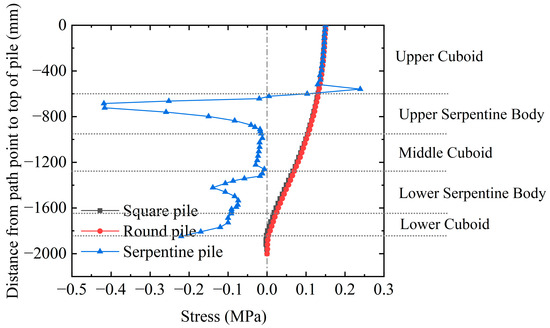 The stress distribution analysis under a 6 kN uplift load focuses on extracting stress along paths 1, 2, and 3 as illustrated in Figure 8. In square and round piles, the stress path primarily exhibits tensile stress with a curved profile along the pile shaft. At the pile top, the maximum tensile stress registers at 0.15 MPa, while the minimum occurs at the pile bottom, measuring 0 MPa. Contrastingly, the stress path of serpentine piles manifests both tensile and compressive stresses. The stress pattern is distinctive: the upper rectangular body mainly experiences tensile stress. Within the 0–500 mm range from the pile top, the magnitude of tensile stress aligns closely with that observed in square and round piles. Noteworthy is the sudden surge in tensile stress about 500 mm from the top, peaking at 0.24 MPa. Subsequent to this peak, the tensile stress diminishes, transitioning to compressive stress upon interfacing with the upper serpentine body. The upper edge of the upper serpentine body endures a peak compressive stress at 0.44 MPa, tapering towards stabilization within the middle rectangular body. The pattern continues with a gradual decrease in compressive stress at the bottom of the middle rectangular body until encountering the lower serpentine body. Elevated compressive stress peaks at the upper edge of the lower serpentine body at 0.15 MPa before diminishing towards the lower rectangular body. Notably, the lower rectangular body experiences a continuous downward increase in compressive stress along the pile shaft, culminating in approximately 0.23 MPa at the pile bottom. The presence of compressive stress in serpentine piles stems from the soil’s downward reaction force on the upper serpentine body when subjected to uplift loads. This compression effect cascades through the upper and lower snake skin bodies, introducing compressive stress within the pile body.