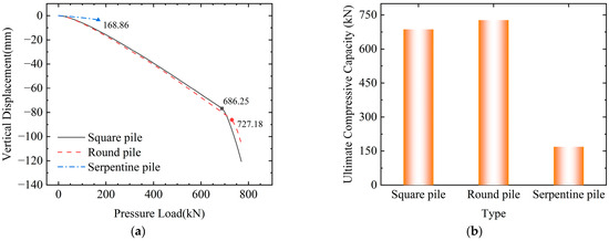 The load–displacement curves and ultimate compressive bearing capacities of square piles, round piles, and serpentine piles under compressive loads are detailed in Figure 10. Square piles exhibit an ultimate compressive bearing capacity of 686.25 kN, round piles of 727.18 kN, and serpentine piles of 168.86 kN. Notably, square piles lead with the highest compressive bearing capacity, followed by round piles, while serpentine piles trail behind with the lowest value. All three pile types surpass the 36 kN threshold, meeting the stipulated requirements for compressive bearing capacity.