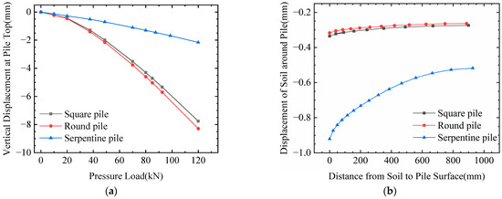 In Figure 11a, as the pressure load on the pile top increases from 0 kN to 120 kN, the square pile top’s displacement slightly undercuts that of the round pile under similar pressure loads, yet surpasses the displacement of the serpentine pile. At 120 kN, the serpentine pile top records a displacement of −2.1 mm, the square pile top at −7.9 mm, and the round pile top at −8.1 mm. Notably, the displacement at the tops of square and round piles is approximately four times that of the serpentine pile top under the same load.