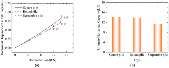Figure 14 showcases the load–displacement curve and ultimate horizontal bearing capacity of three types of piles under horizontal loads. The ultimate horizontal bearing capacity is 14.22 kN for square piles, 13.92 kN for round piles, and 11.42 kN for serpentine piles. Notably, square piles exhibit the highest ultimate horizontal bearing capacity, followed by round piles, with serpentine piles having the lowest. All three pile types surpass the 7 kN threshold, meeting the prescribed horizontal bearing capacity requirements.