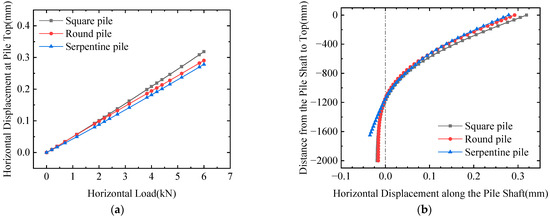 In Figure 15a, as the horizontal load on the piles escalates from 0 to 6 kN, under identical loads, the square pile’s top showcases the largest horizontal displacement, followed by the round pile, with the serpentine pile exhibiting the smallest displacement. At a 6 kN load, the horizontal displacement at the top of the square pile measures 0.31 mm, the round pile at 0.29 mm, and the serpentine pile at 0.28 mm.