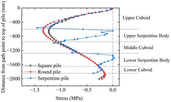- The tensile side of the serpentine pile features a blend of tensile and compressive stresses, with tensile stress prevailing. Progressing along the upper cuboid, tensile stress follows an ascending curve within 0–500 mm from the top, aligning closely with the square pile’s stress path. Noteworthy is the abrupt increase to a peak of 1.54 MPa at 500 mm from the top, followed by a gradual transition into compressive stress. The upper edge of the upper snake skin exhibits a peak lateral compressive stress of 0.49 MPa before transforming into gradually increasing tensile stress. Successive peaks and transitions occur at specific junctures within the pile structure, culminating in a gradual shift from tensile to compressive stress towards the lower cuboid. The longitudinal assessment concludes with a gradual transformation of tensile stress into compressive stress, culminating in a stress value of 0.28 MPa at the pile bottom.