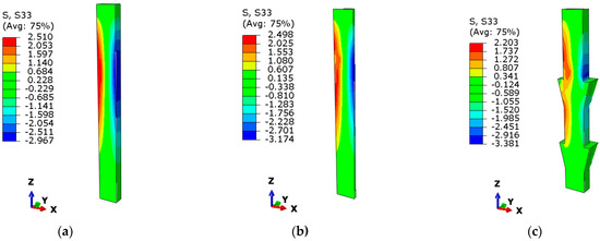 Profile section of pile stress distribution of each pile in horizontal charge limit (unit: MPa). (a) Square pile. (b) Round pile. (c) Serpentine pile.