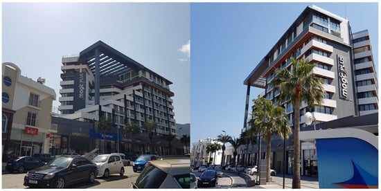 The following sections provide photographs and detailed descriptions about the selected six distinctive buildings (see Table 2), including their names, actual function, height, aesthetic structure qualities (façade design), as well as vertical circulation to help the readers in gaining a deeper understanding of the buildings. A map is provided to show the location of Kyrenia and the case study (CS) building locations within the city (see Figure 1). Additionally, aerial photographs are also added to reveal buildings within the existing urban context. It is important to highlight that these descriptions were not presented to the subjects.