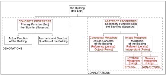 This section of the research paper explains how the symbolic and sensory metaphors integrated into the semiotic model of architecture (Figure 8). The building (the sign) could mainly be studied under two main headings: concrete and abstract properties in the study of semiotics. The concrete properties of the building could be associated with the “signifier” of Saussure [72], the “primary function” of Eco [73,74], “denotation” of Saussure and Eco, and the “representamen” of Peirce [47]. Concrete properties were about the function and physical form of the building. Concrete properties could be divided into two sub-headings. These were the actual function and formal aesthetics (aesthetic and structure qualities) of the building.