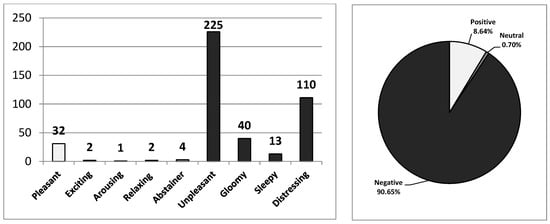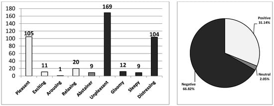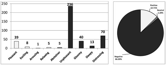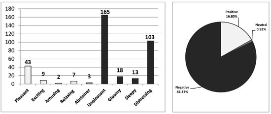 On the other hand, 163 different varieties of sensory metaphors were produced by subjects. Of these, 33 were positive senses, 1 of them was a neutral sense, and 129 sensory metaphors were classified as negative senses. In total, 363 sensory metaphors were produced and 61 of them were positive (pleasant—43, exciting—9, arousing—2, and relaxing—7), 3 of them were neutral (abstainer—3), and 299 sensory metaphors were negative (unpleasant—165, gloomy—18, sleepy—13, and distressing—103). This means that 16.80% were positive senses, 0.83% were neutral senses, and 82.37% were negative senses out of total number of sensory metaphors (Figure 9). The authors have listed the metaphors that were above the average value as a result of these vast numbers of sensory metaphor findings (Table 3).